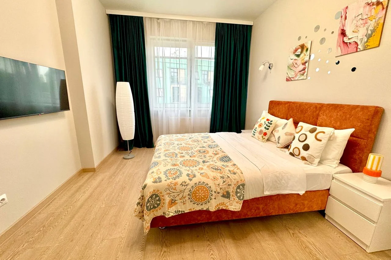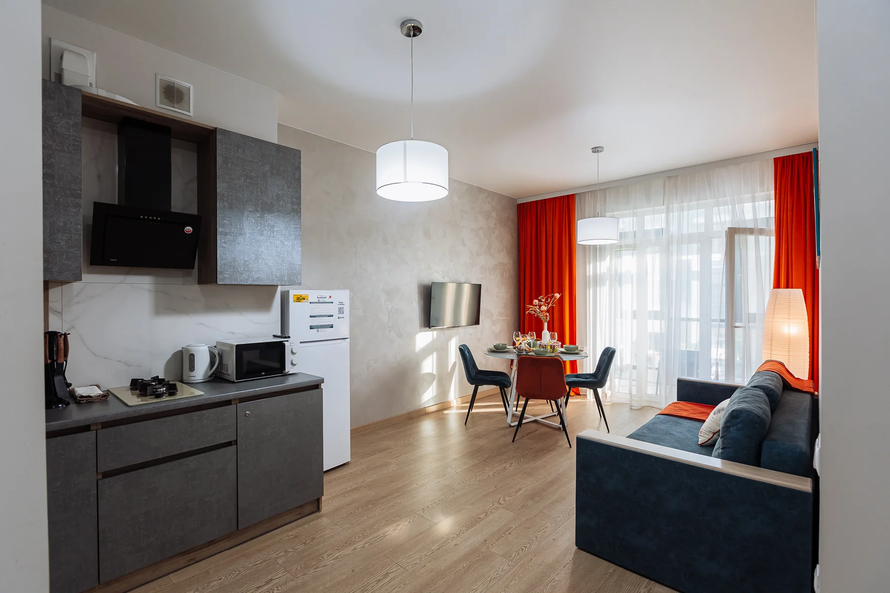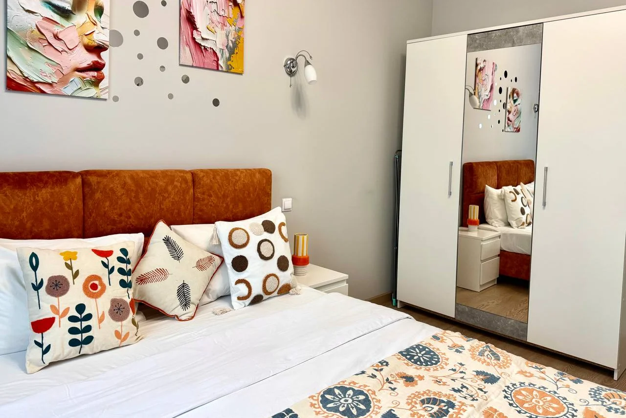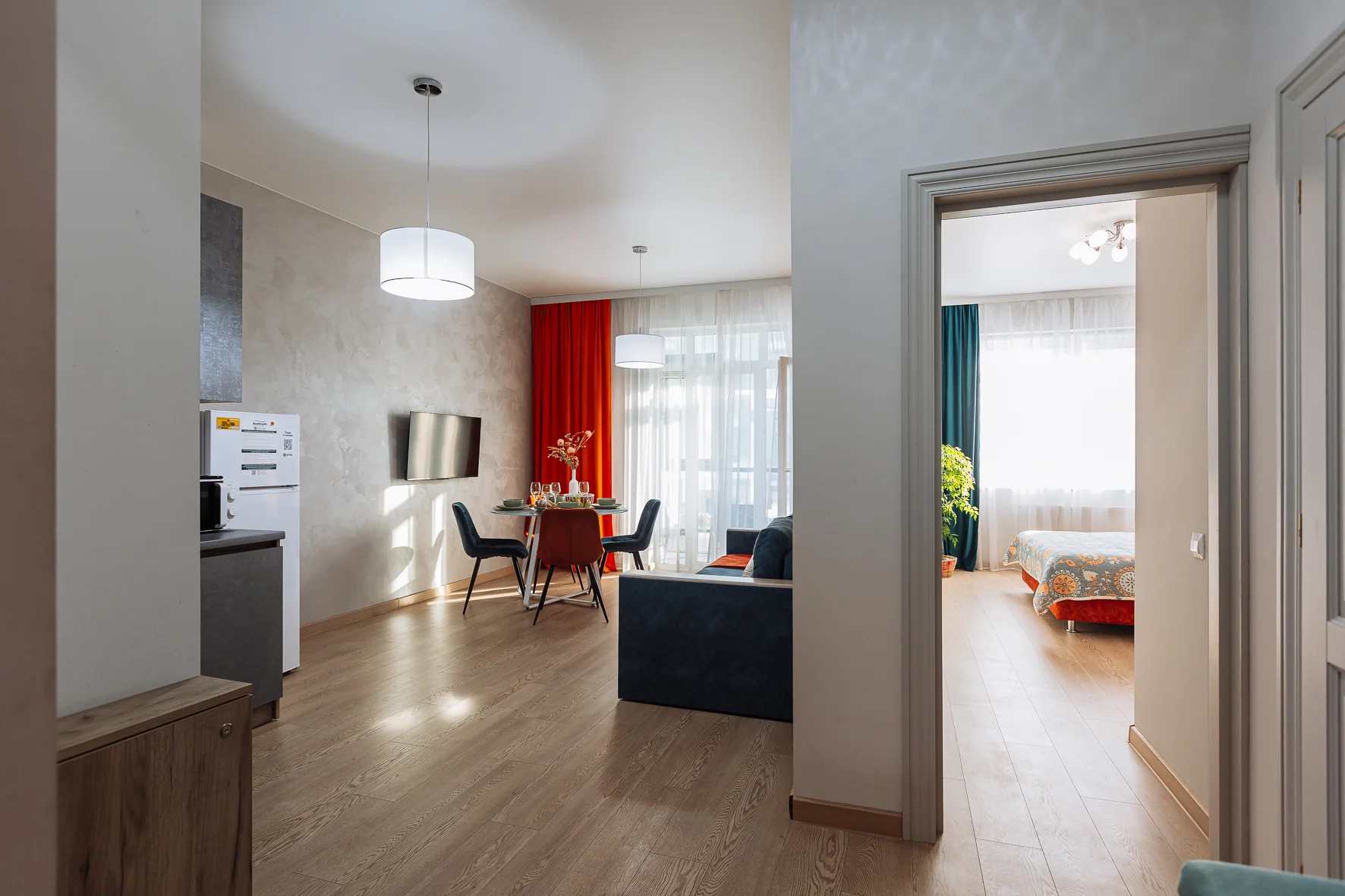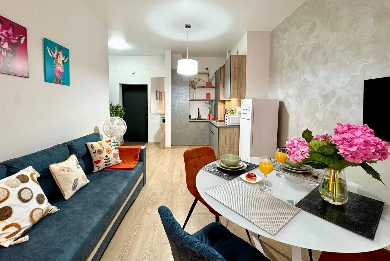 Квартира оформлена в светлых тонах, с яркими элементами современной мебели. Комнаты изолированы: в спальне двуспальная кровать, а на кухне раскладной диван 160х200, что позволяет разместить до 4-х человек. Санузел совмещен, имеется душевая кабина.