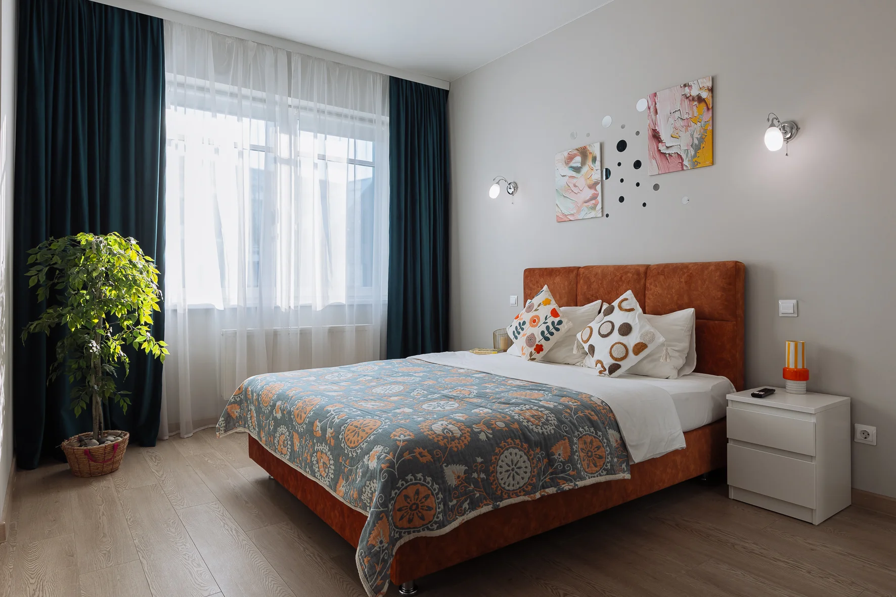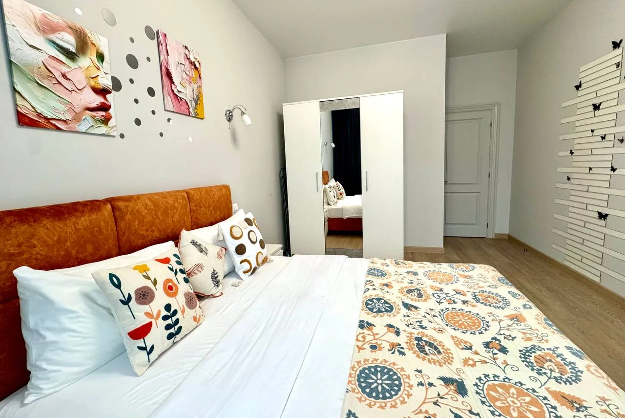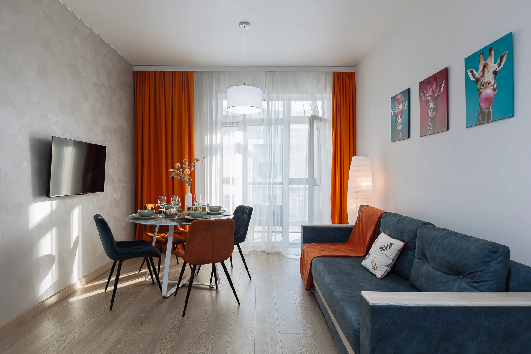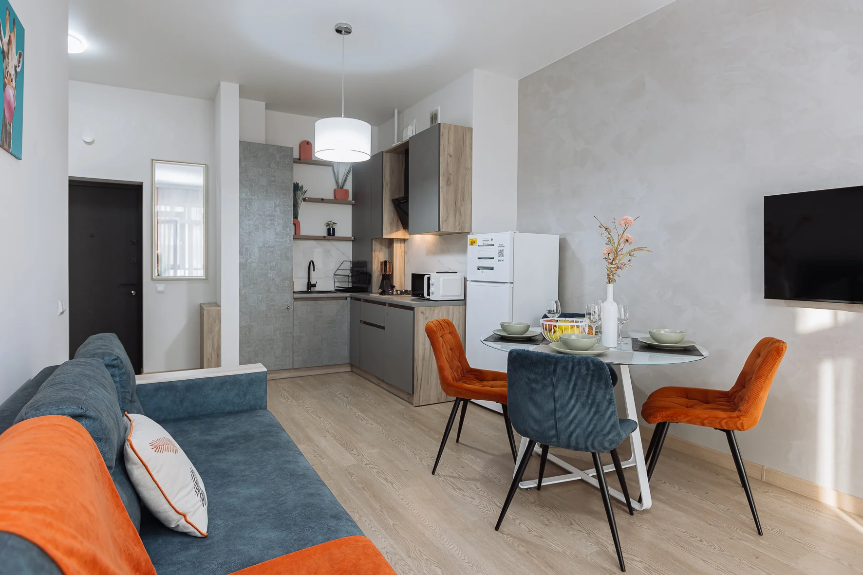 Квартира оформлена в светлых тонах, с яркими элементами современной мебели. Комнаты изолированы: в спальне двуспальная кровать, а на кухне раскладной диван 160х200, что позволяет разместить до 4-х человек. Санузел совмещен, имеется душевая кабина.