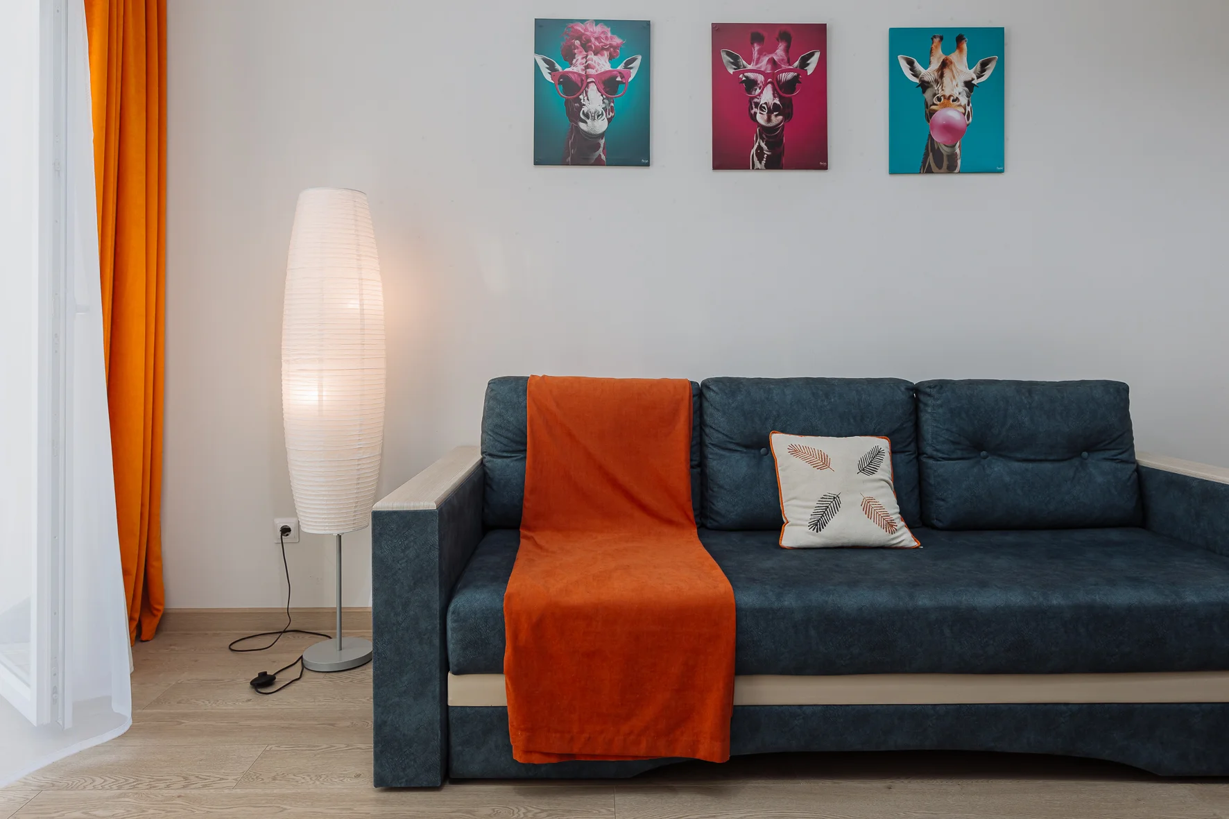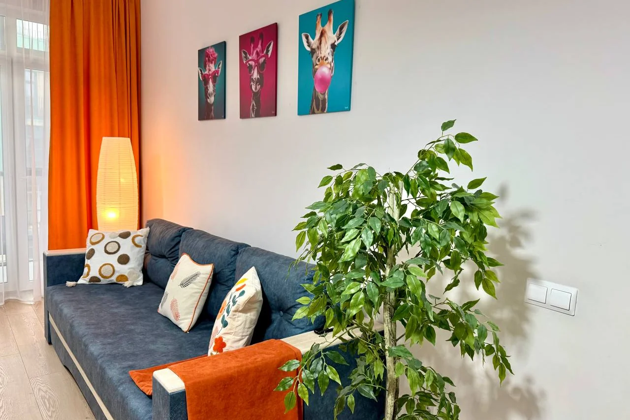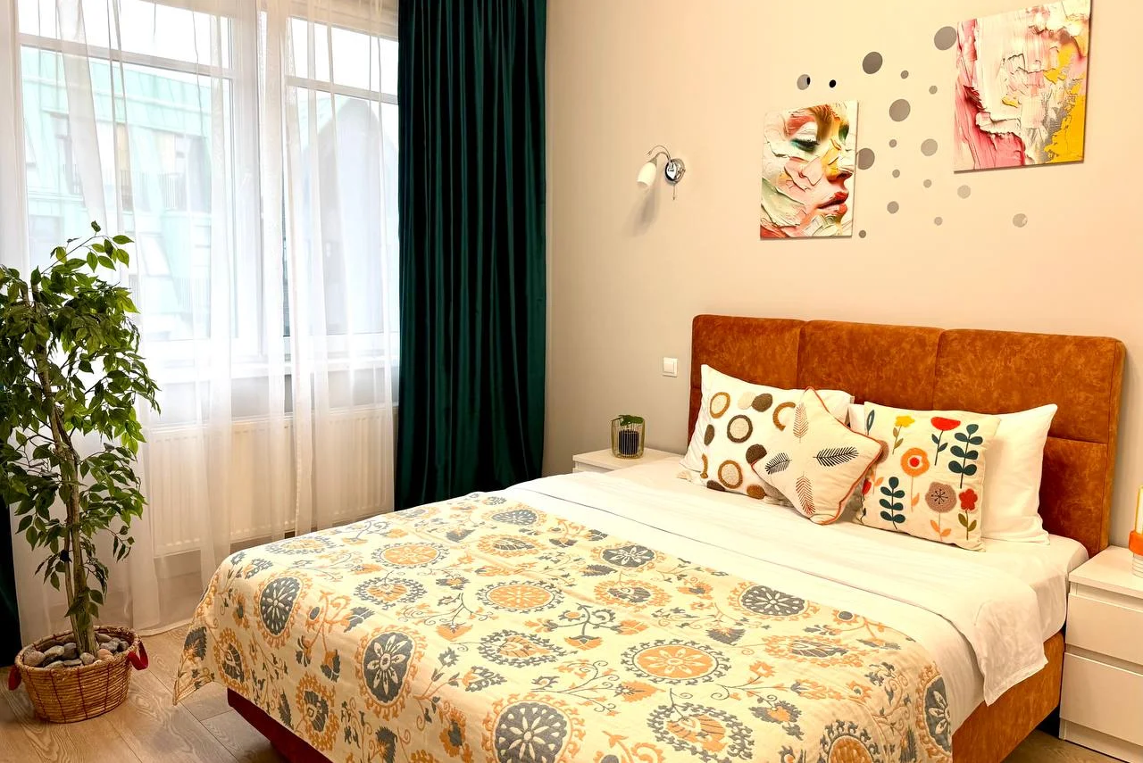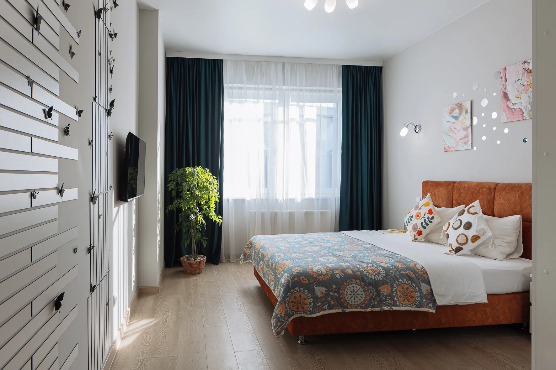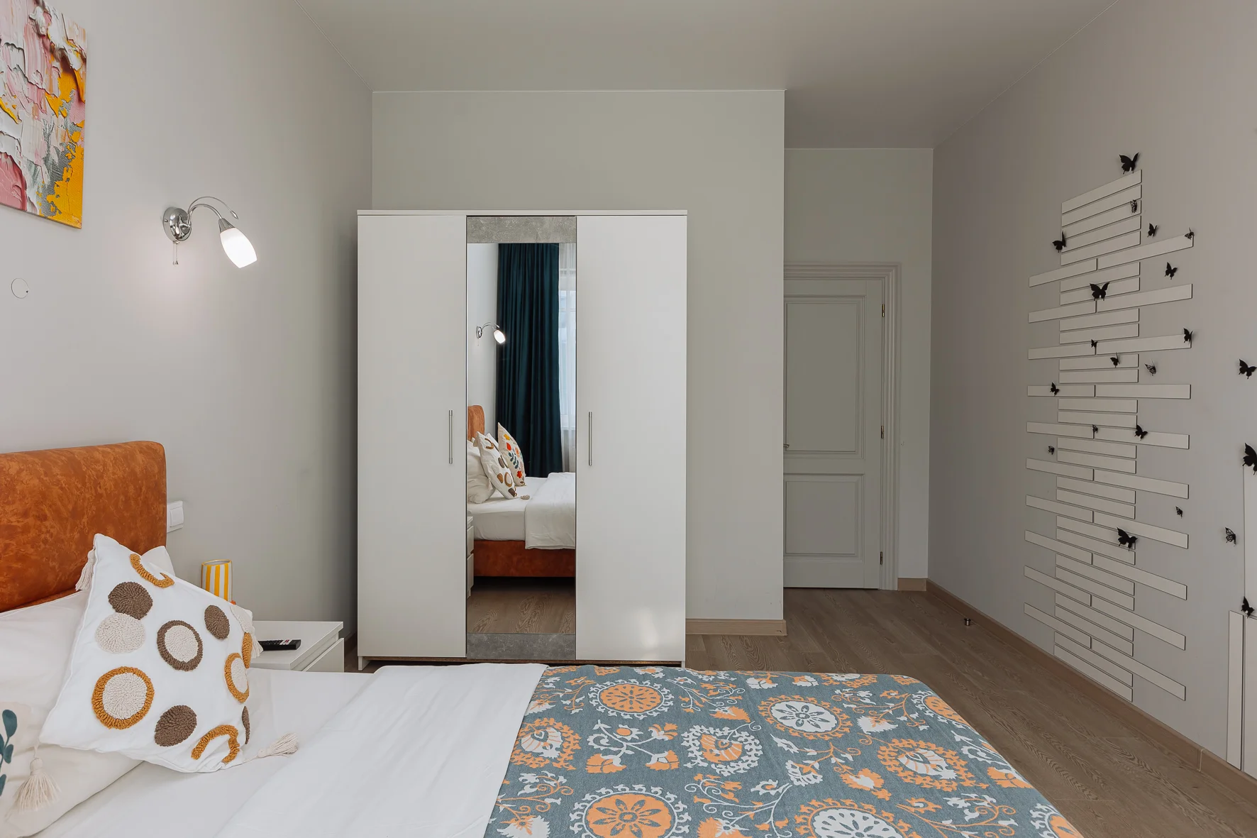 Квартира оформлена в светлых тонах, с яркими элементами современной мебели. Комнаты изолированы: в спальне двуспальная кровать, а на кухне раскладной диван 160х200, что позволяет разместить до 4-х человек. Санузел совмещен, имеется душевая кабина.