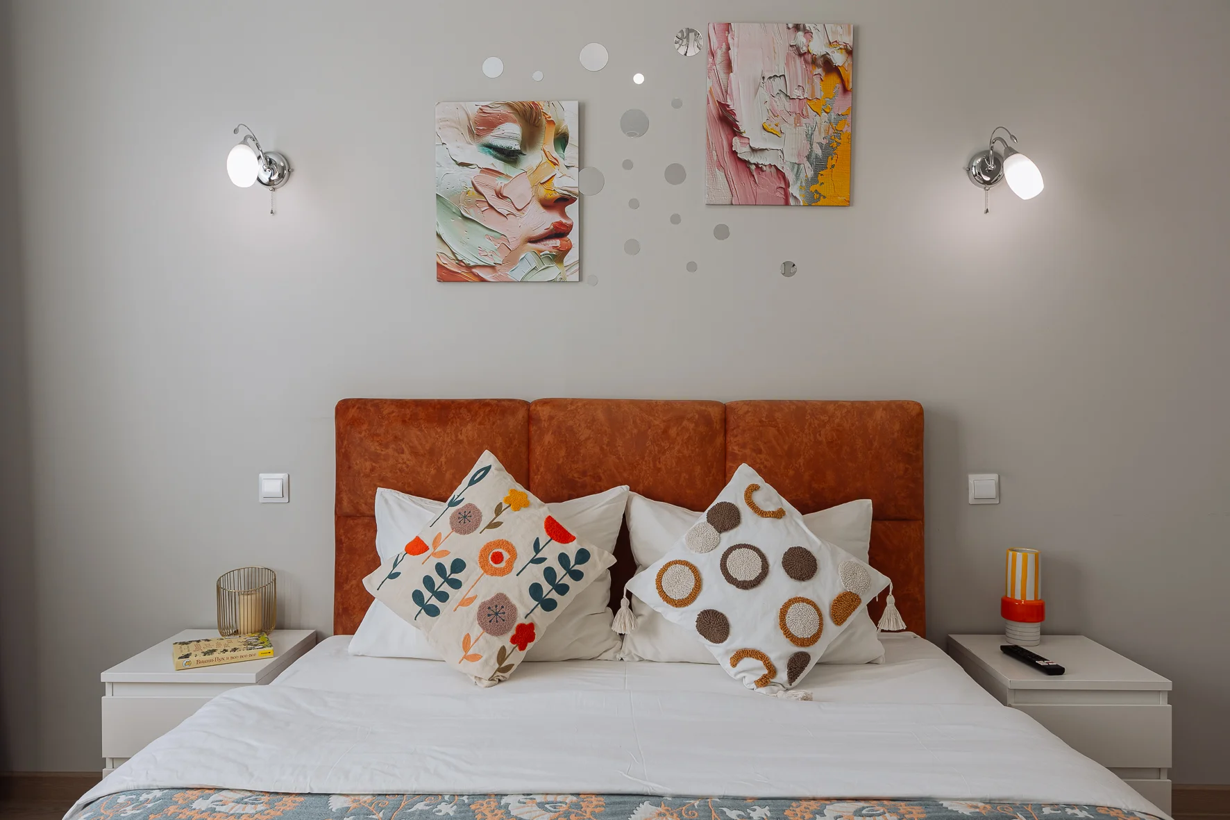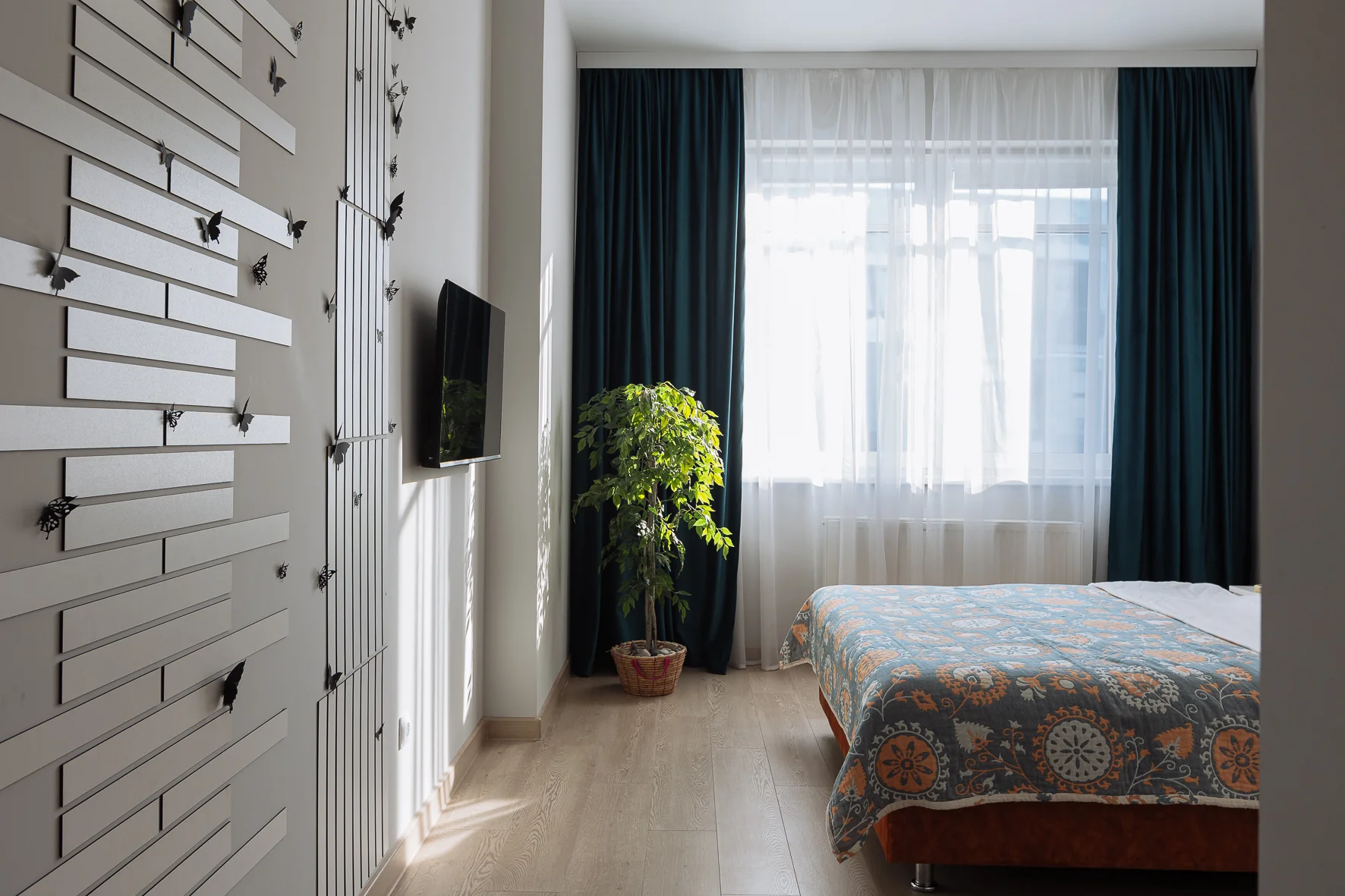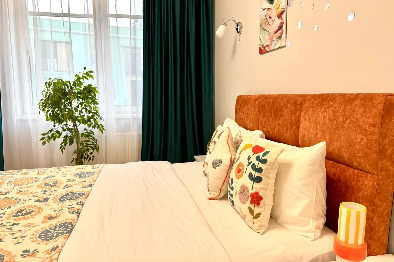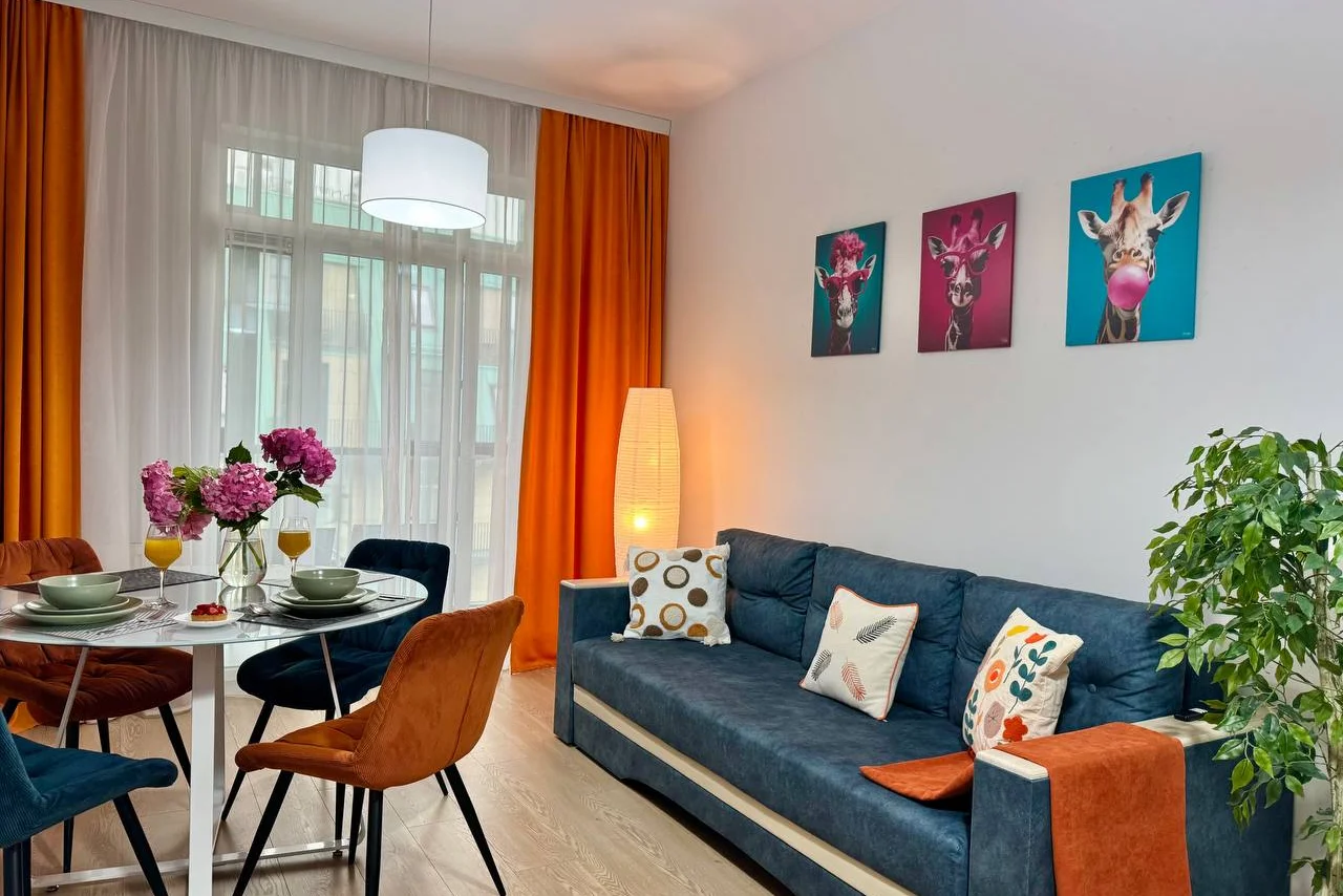 Квартира оформлена в светлых тонах, с яркими элементами современной мебели. Комнаты изолированы: в спальне двуспальная кровать, а на кухне раскладной диван 160х200, что позволяет разместить до 4-х человек. Санузел совмещен, имеется душевая кабина.