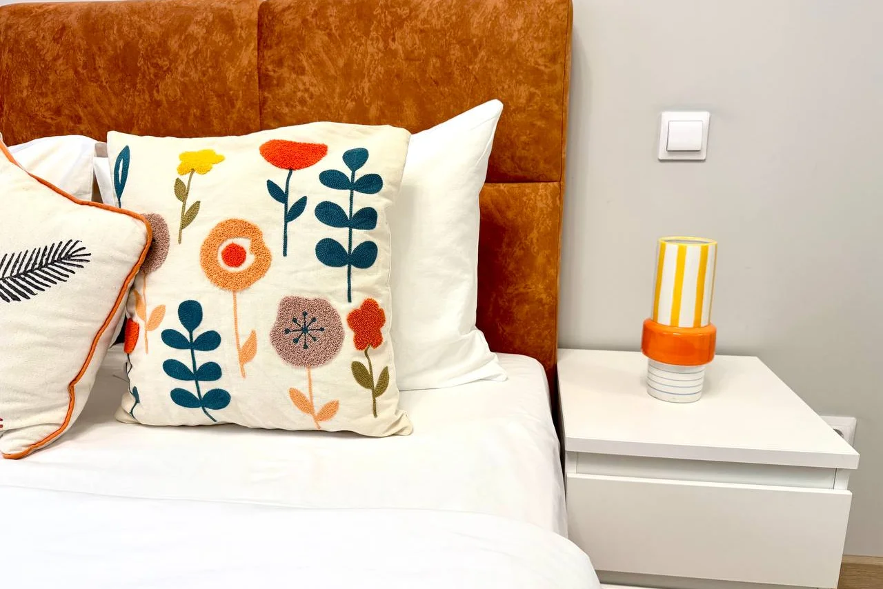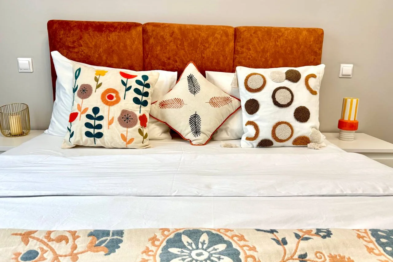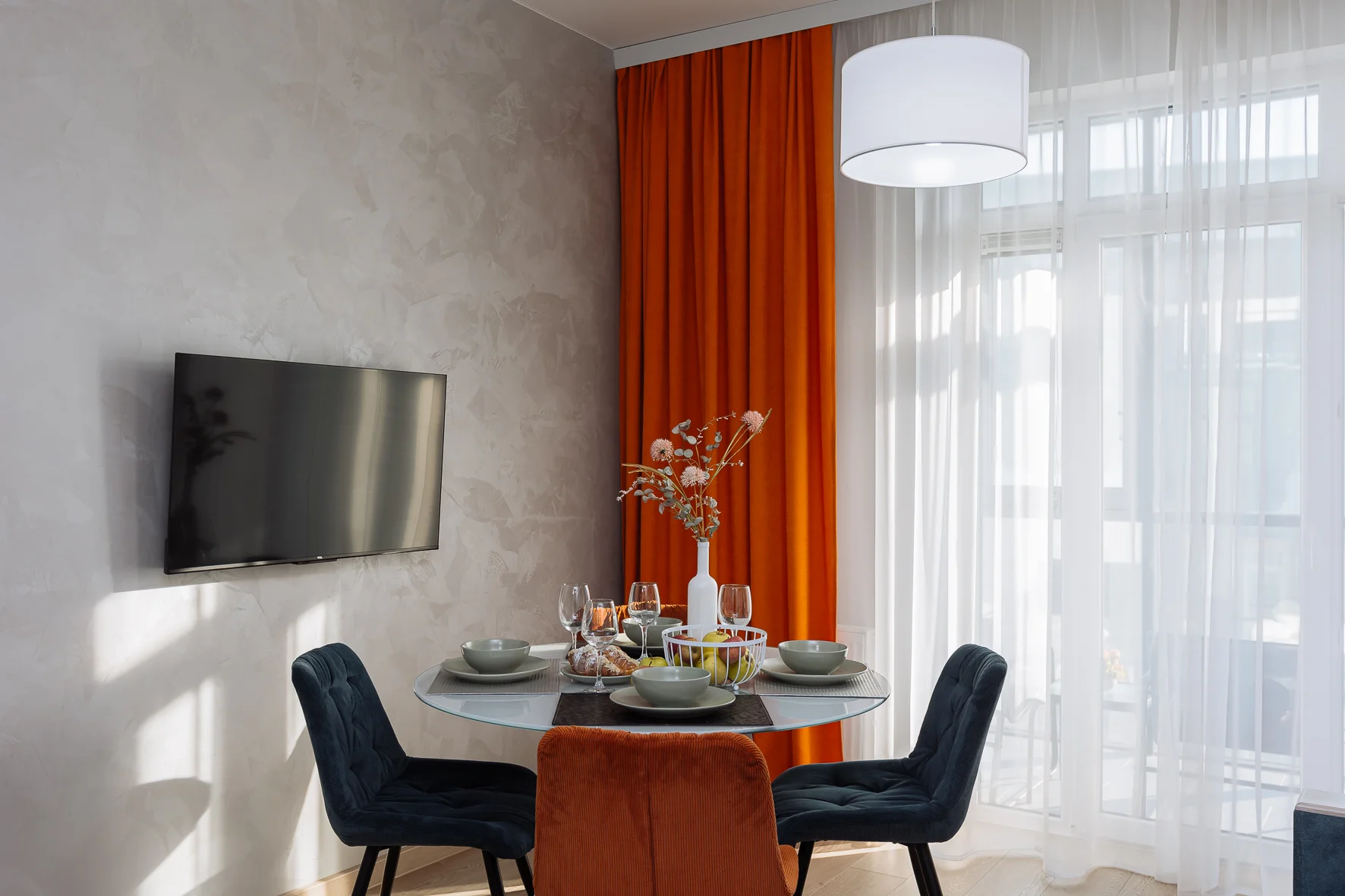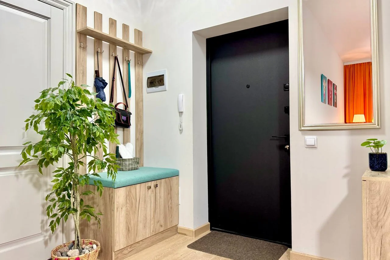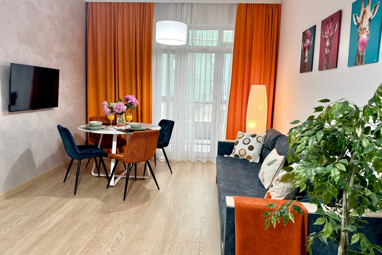 Квартира оформлена в светлых тонах, с яркими элементами современной мебели. Комнаты изолированы: в спальне двуспальная кровать, а на кухне раскладной диван 160х200, что позволяет разместить до 4-х человек. Санузел совмещен, имеется душевая кабина.