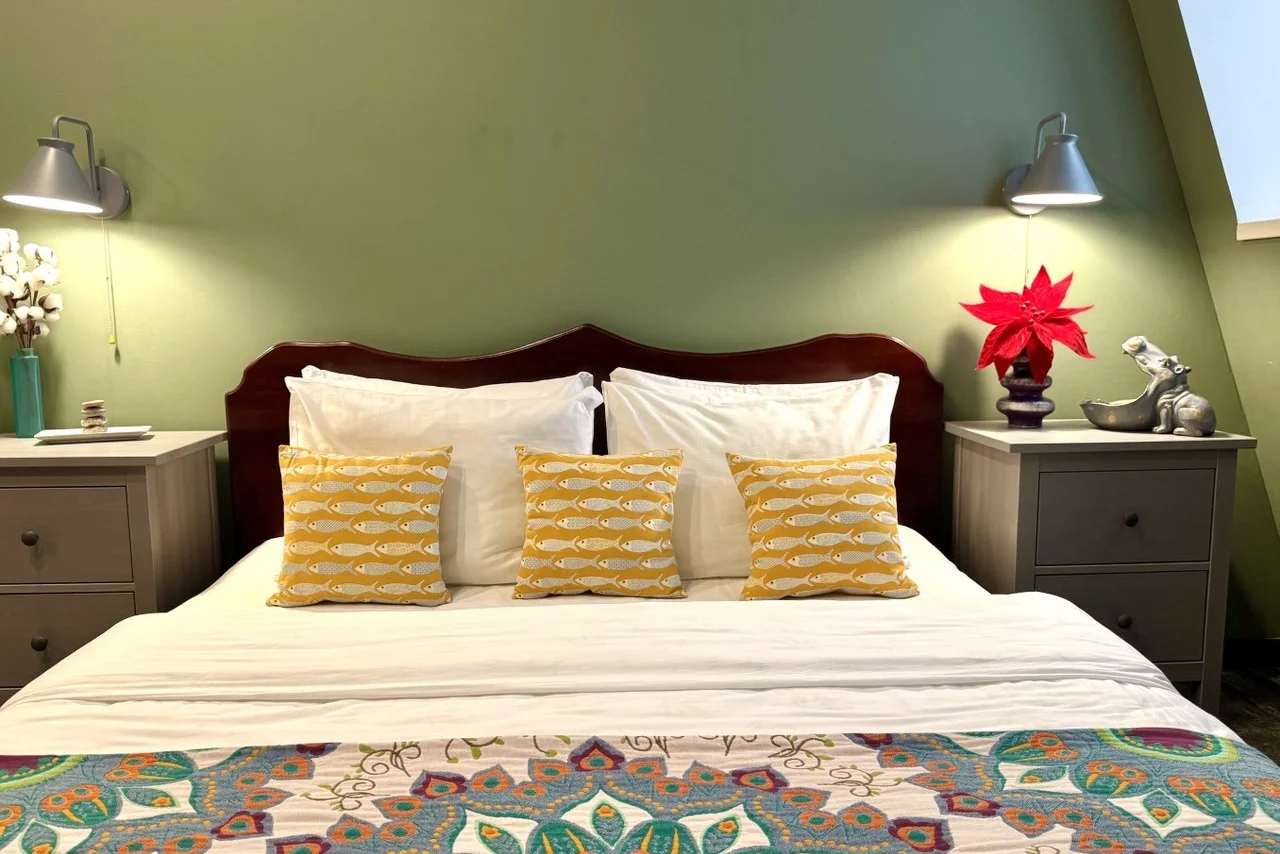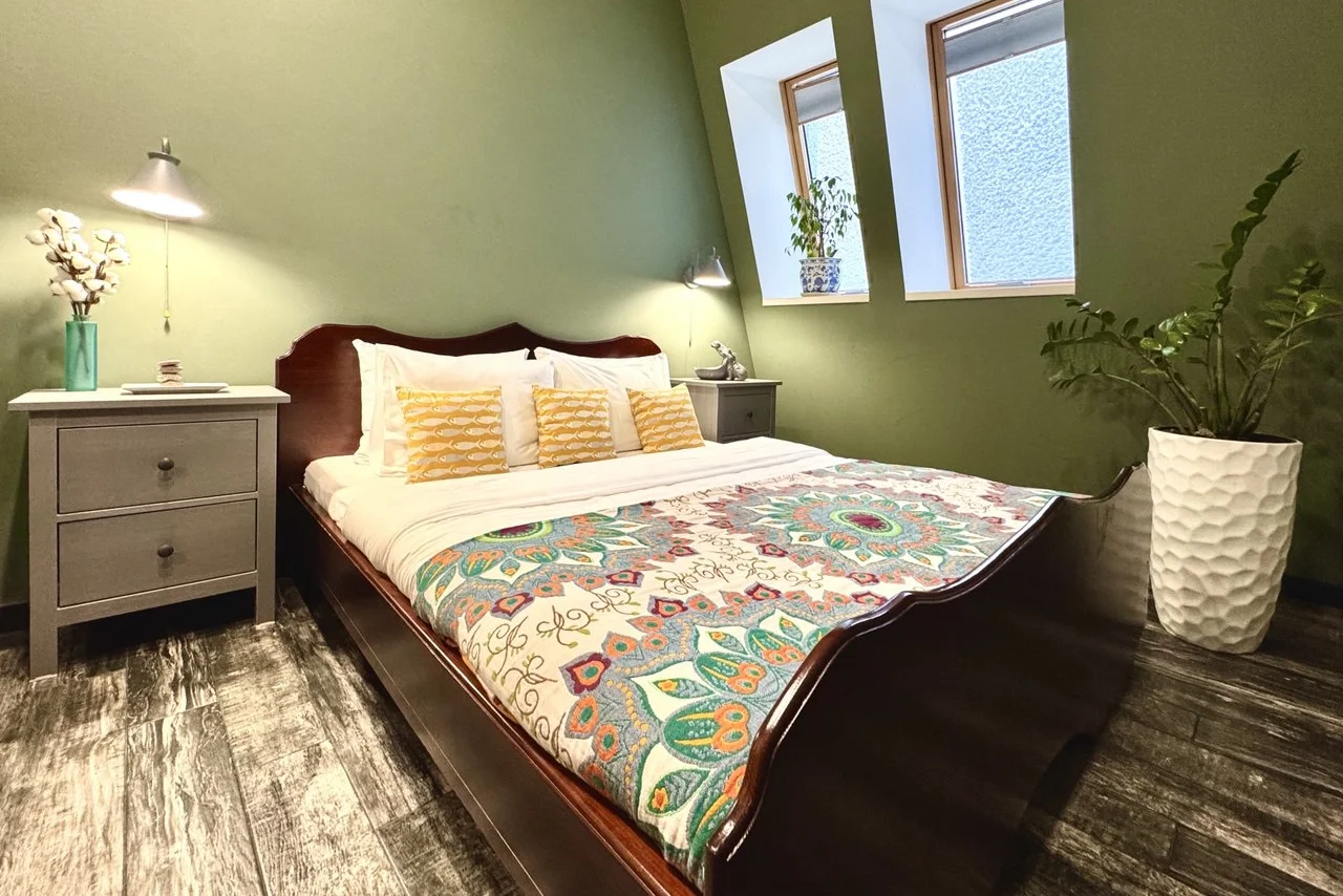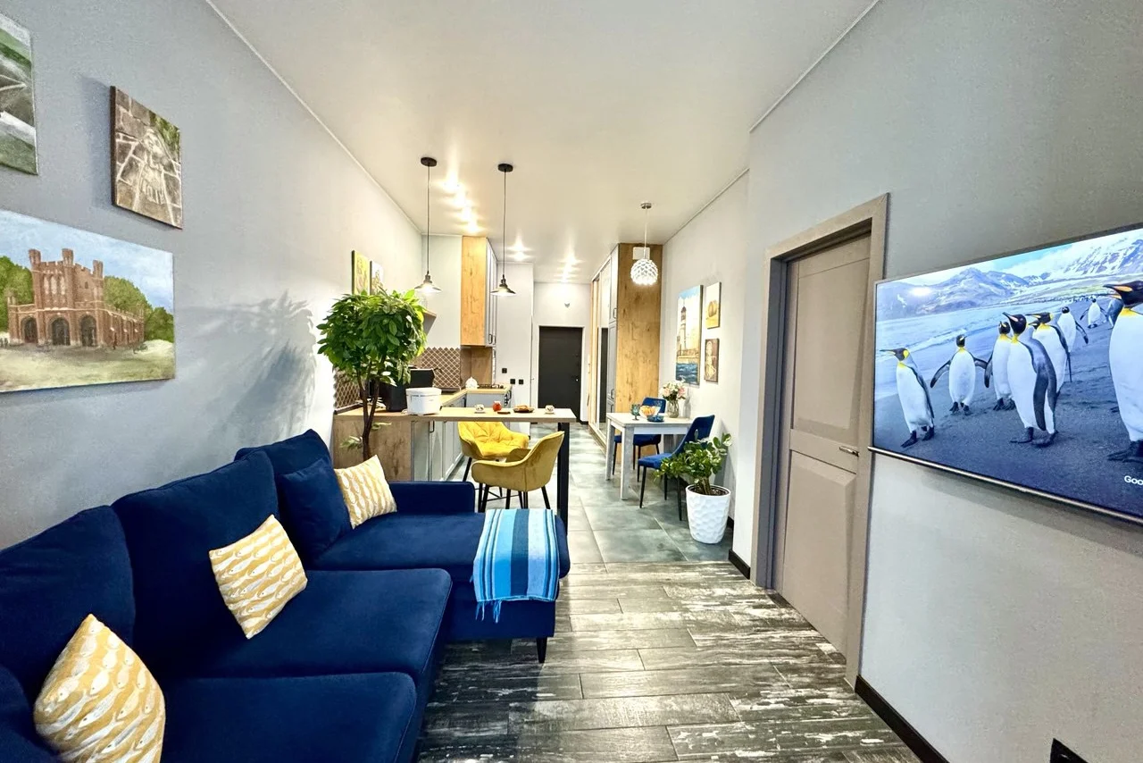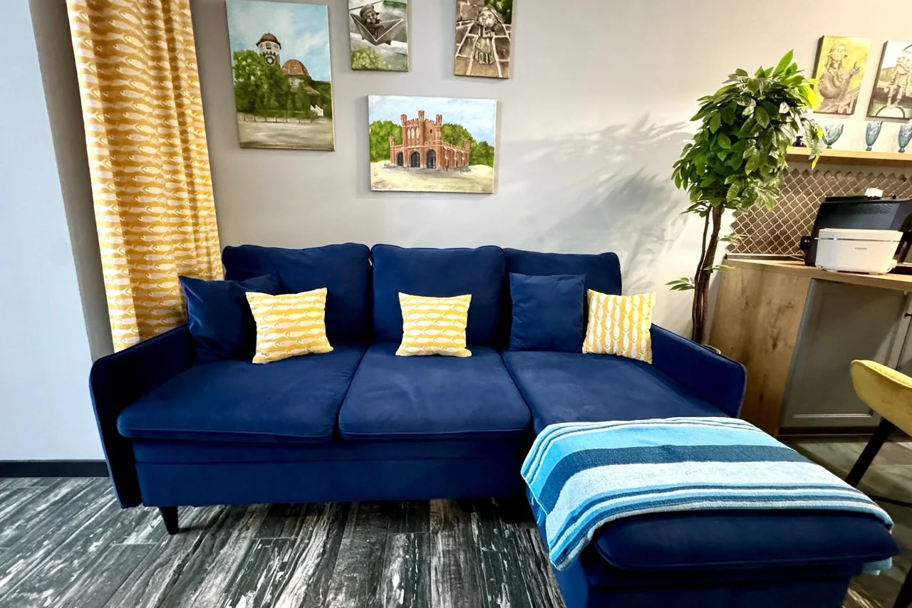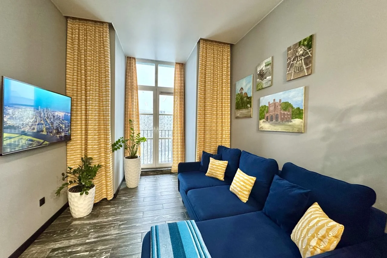 Планировка квартиры состоит из изолированной спальни с двуспальной кроватью (160х200) и кухни-гостиной, в которой расположен двухместный диван (160х200). Максимальное количество гостей в квартире – 4 чел. В наличие два санузла, один из которых с ванной. Из гостиной есть выход на открытый балкон.