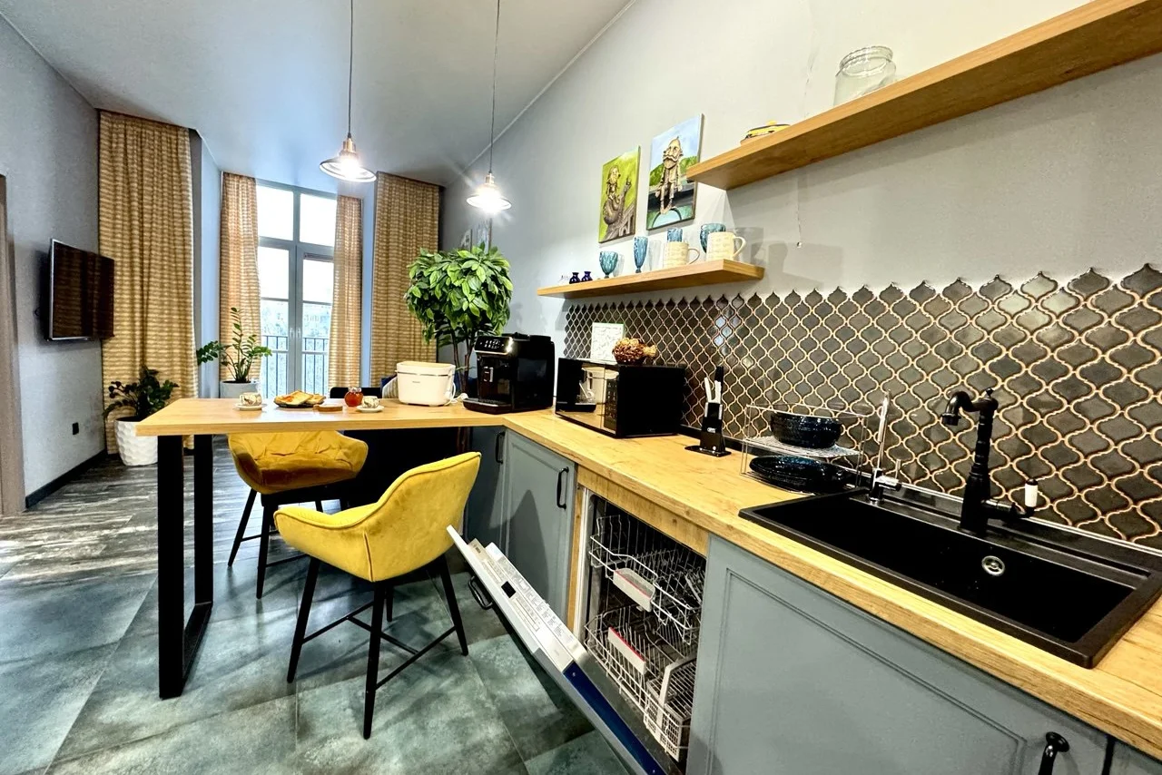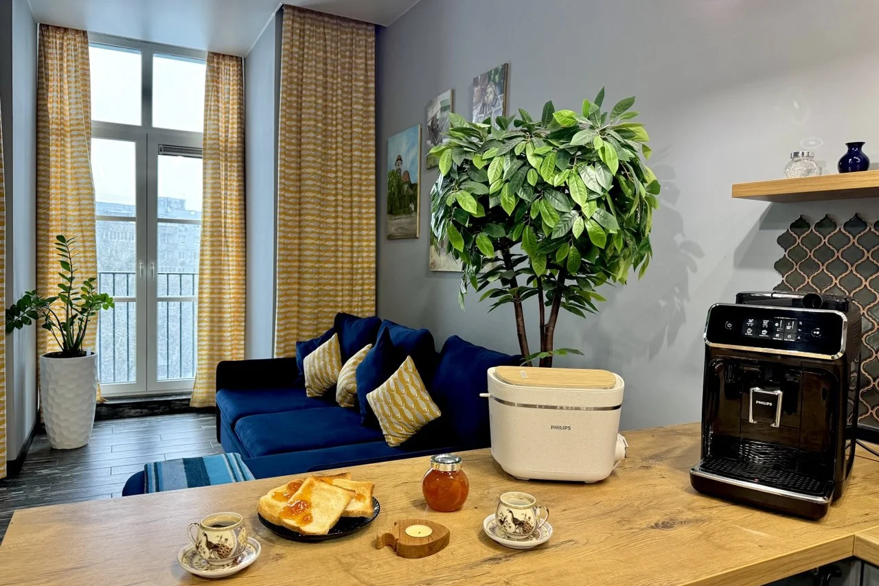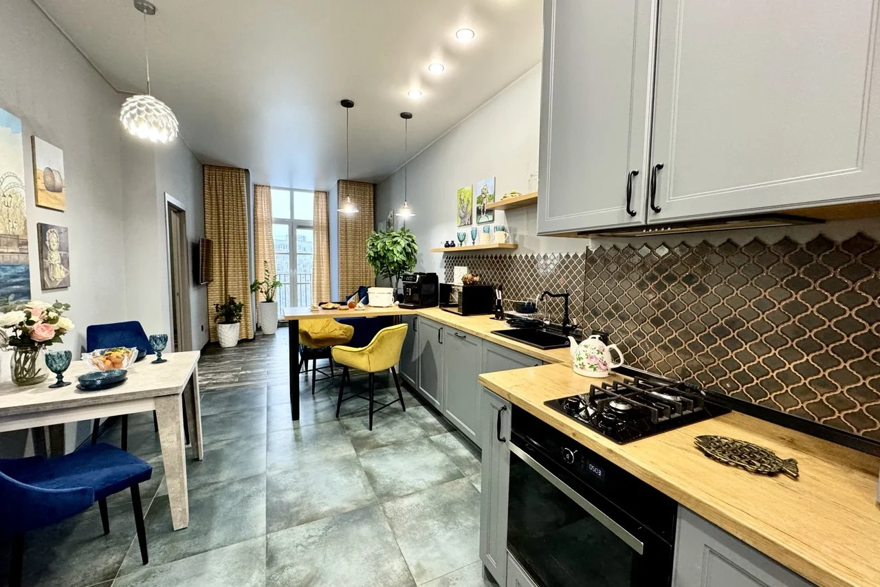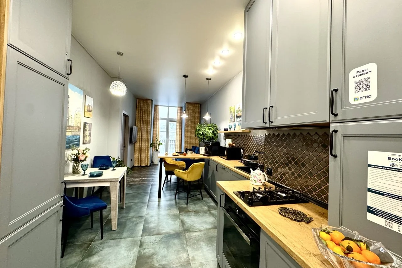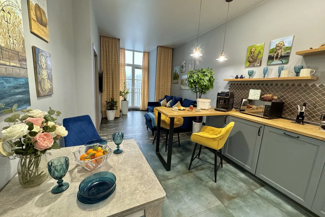 Евродвушка с дизайнерским ремонтом, расположена в элитном доме на набережной реки Преголь. Из окна открывается потрясающий вид на реку и «Рыбную деревню» - самый престижный и туристический район. Здесь прогулочная зона со множеством кафе и сувенирных лавок. В 5 минутах ходьбы находится остров Канта и главная достопримечательность города – Кафедральный собор. Здесь же отходит экскурсионный автобус, что очень удобно для туристов.